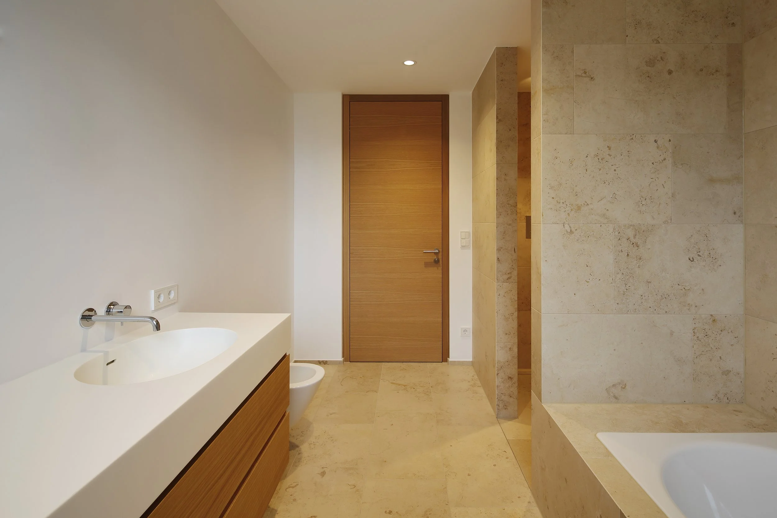 Auch hier wurde auf die Wahrung der Privatsphäre bedacht genommen, ein Sichtschutzelement aus lasierten Fichtenrhombus-Latten schirmt das das östlich angrenzende Schulgebäude mit Spielplatz ab, ohne den Genuss der Morgensonne zu verwehren. Das durchgängige Materialkonzept wird auch auf der Terrasse durch den Bodenbelag aus hellem Naturstein fortgesetzt.