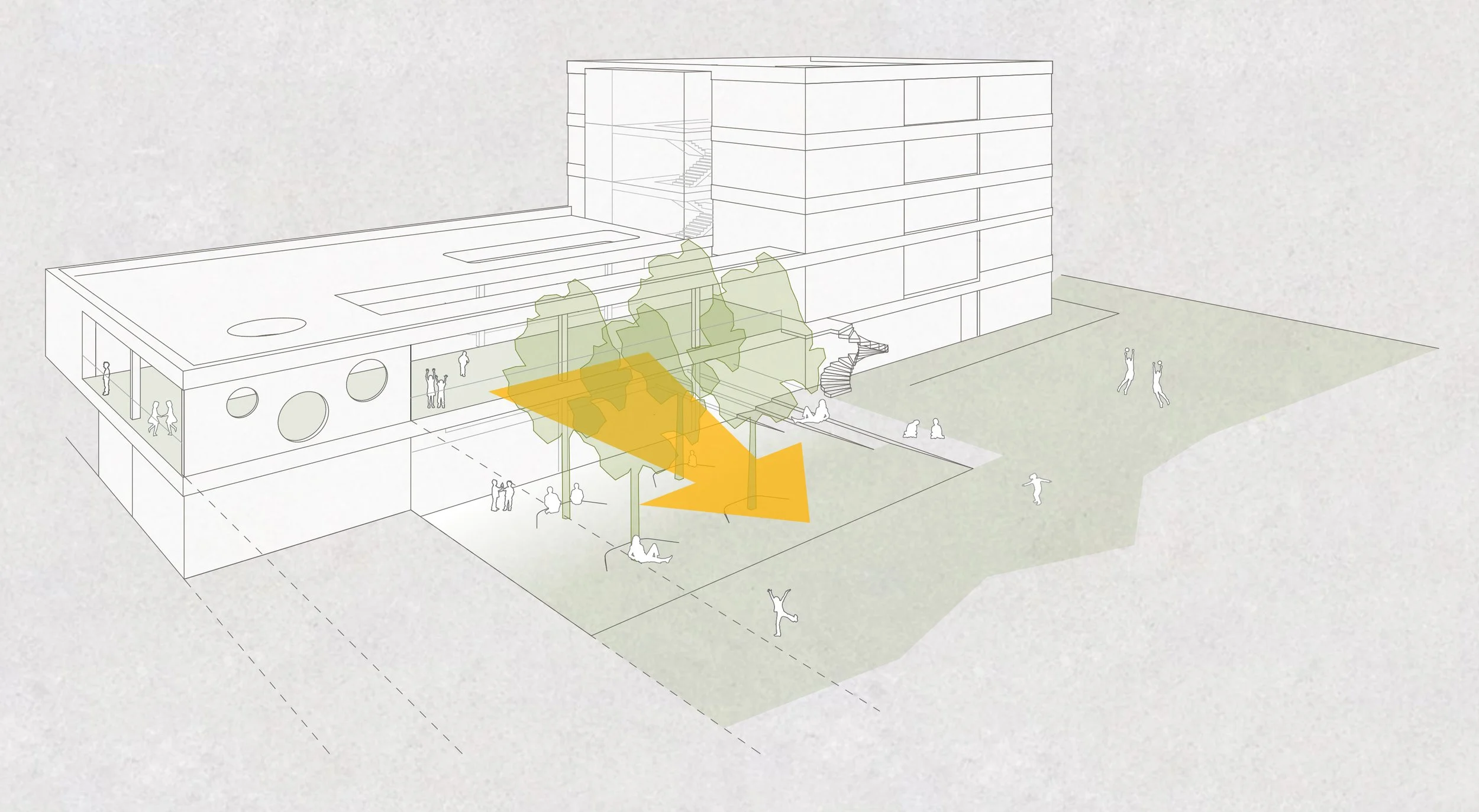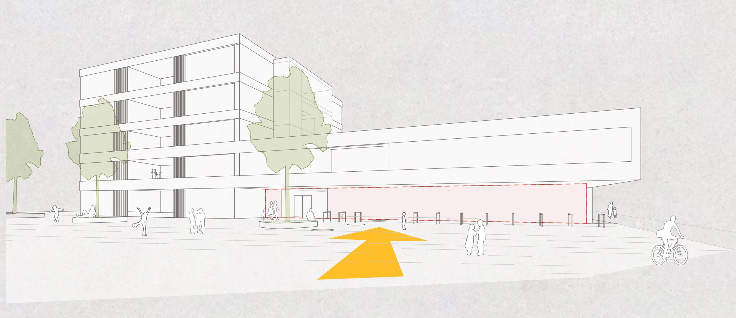 Der Fassadenrücksprung markiert den neuen Haupteingang und erweitert den Vorplatz der Schule. Die Auskragung gewährt den Witterungsschutz für die Fahrradabstellflächen. Die Besucher werden in der offenen, lichtdurchfluteten zweigeschossigen Aula empfangen. Der leicht versenkte Speisesaal wird durch das Öffnen der Fassade vom Innen- zum Außenraum, die nach außen verlängerten und das Gelände aufnehmenden Trittstufen verstärken diese Wirkung und bieten das entsprechende Ambiente für eine multifunkrionale Nutzung – auch abseits des Schulbetriebes.