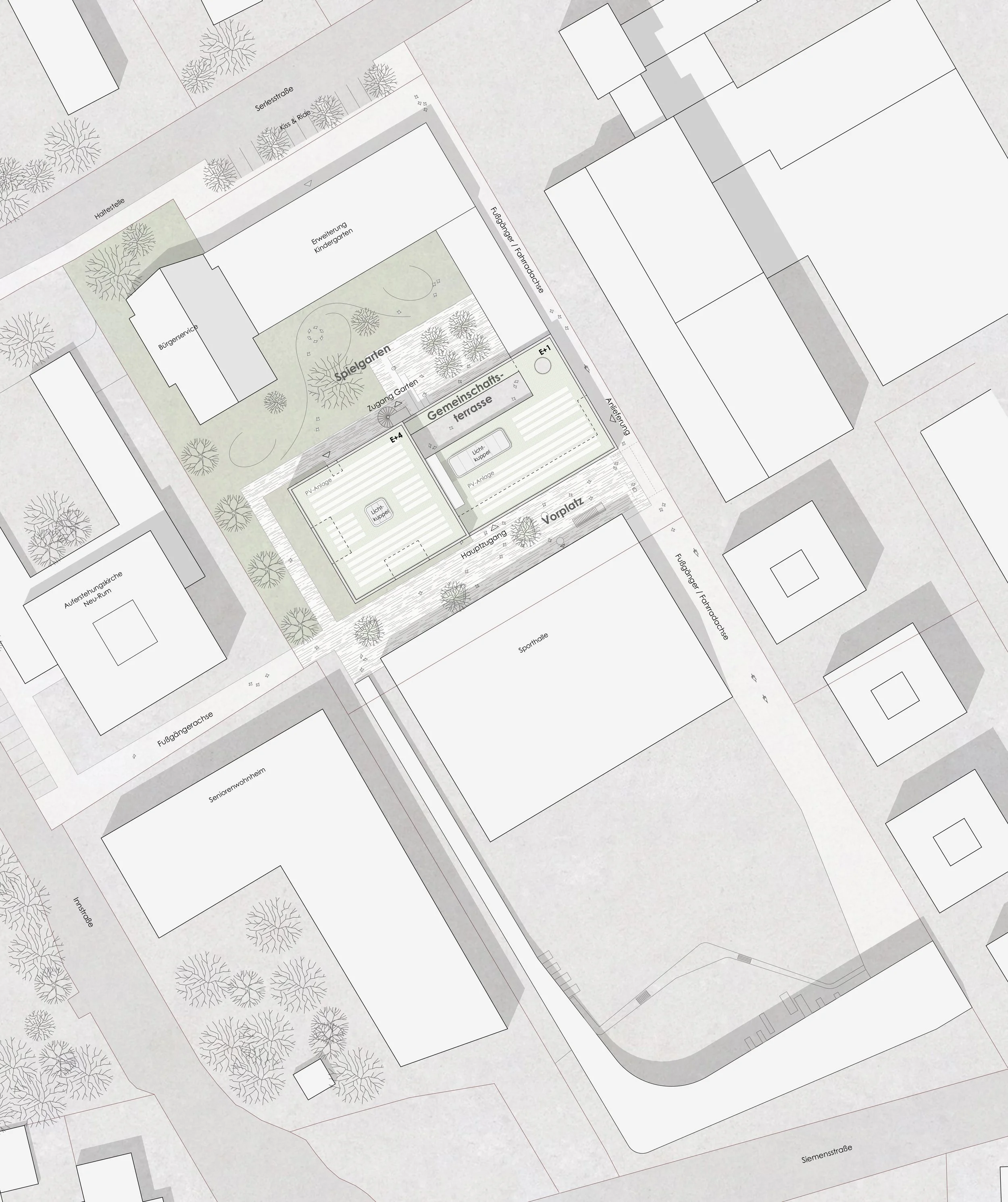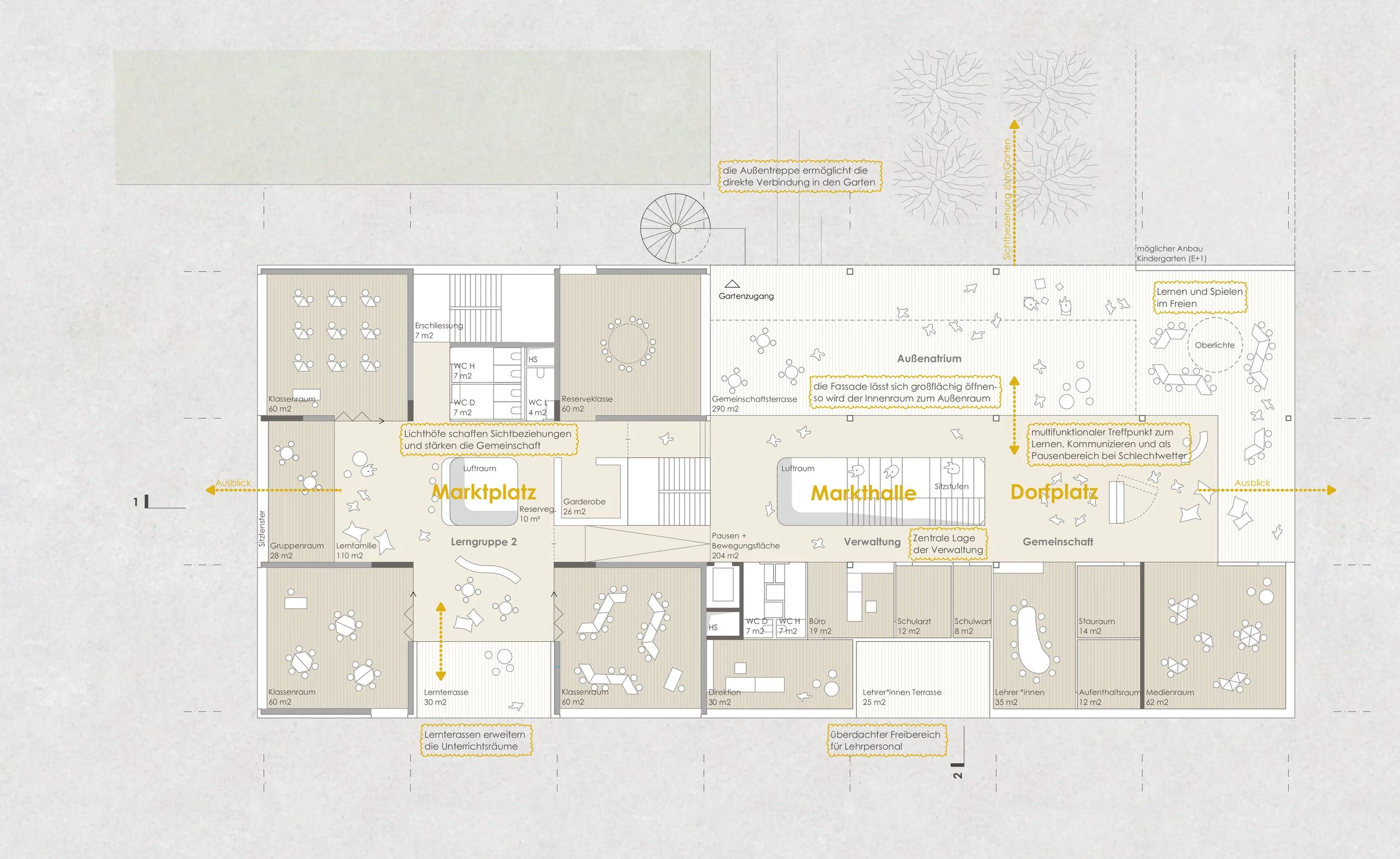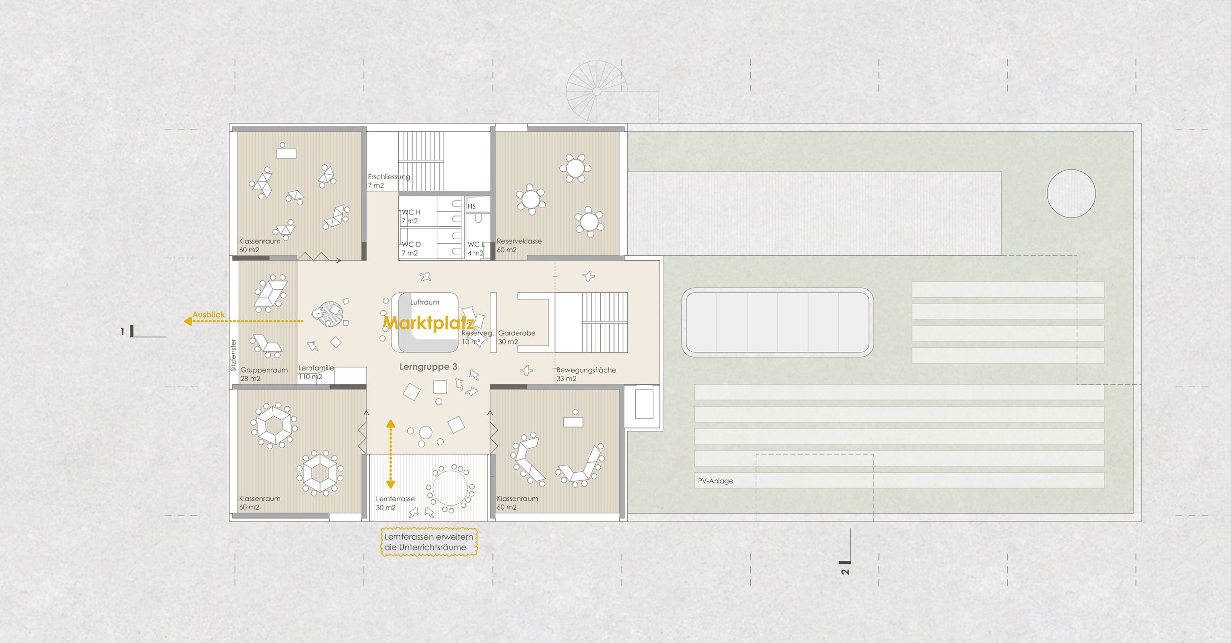 Eine große Treppe mit Sitzstufen verbindet das Erdgeschoss mit dem Obergeschoss, wo die Verwaltung und der Dorfplatz – zentral gelegen und auf kurzem Wege erreichbar – als Herzstück der Schule situiert ist. Die vorgelagerte, teilüberdachte Gemeinschafsterrasse mit Verbindung zum Spielegarten ist Erholungsraum, Lernraum, Kreativraum und Treffpunkt zugleich und lässt sich bei Schlechtwetter in das Innere des Gebäudes erweitern.