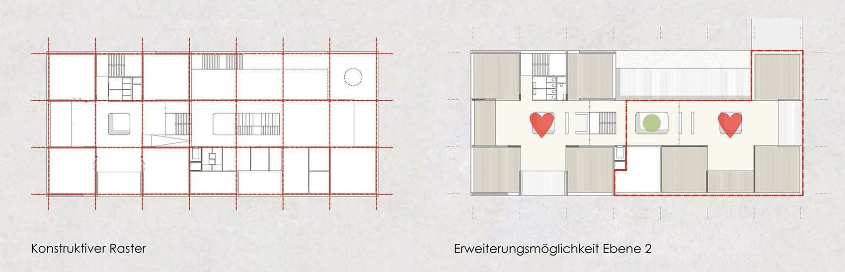 Die neu zu schaffenden Räume werden als logische und wirtschaftliche Weiterfolge des bestehenden Achsrasters in der Vertikalen sowie der Horizontalen generiert.